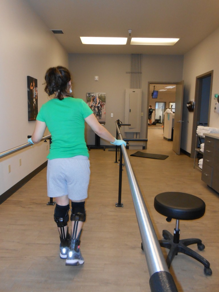 At 10am, he brings in my ExoSyms, real carbon fiber now, with struts and all. He also brings in my shoes and heel lifts that go inside them from last November. He helps me put the devices on and checks the fit. “I’ll be impressed if you get the shoes on,” he says as he walks out the door to another patient. Maybe he just likes setting people up for success. Shimmy the shoe back and forth until it goes over the heel of the device, and it’s not too hard. He did let me know that it’s easier to do one device and one shoe before starting on the other leg, otherwise your carbon-fiber covered feet just slip everywhere.