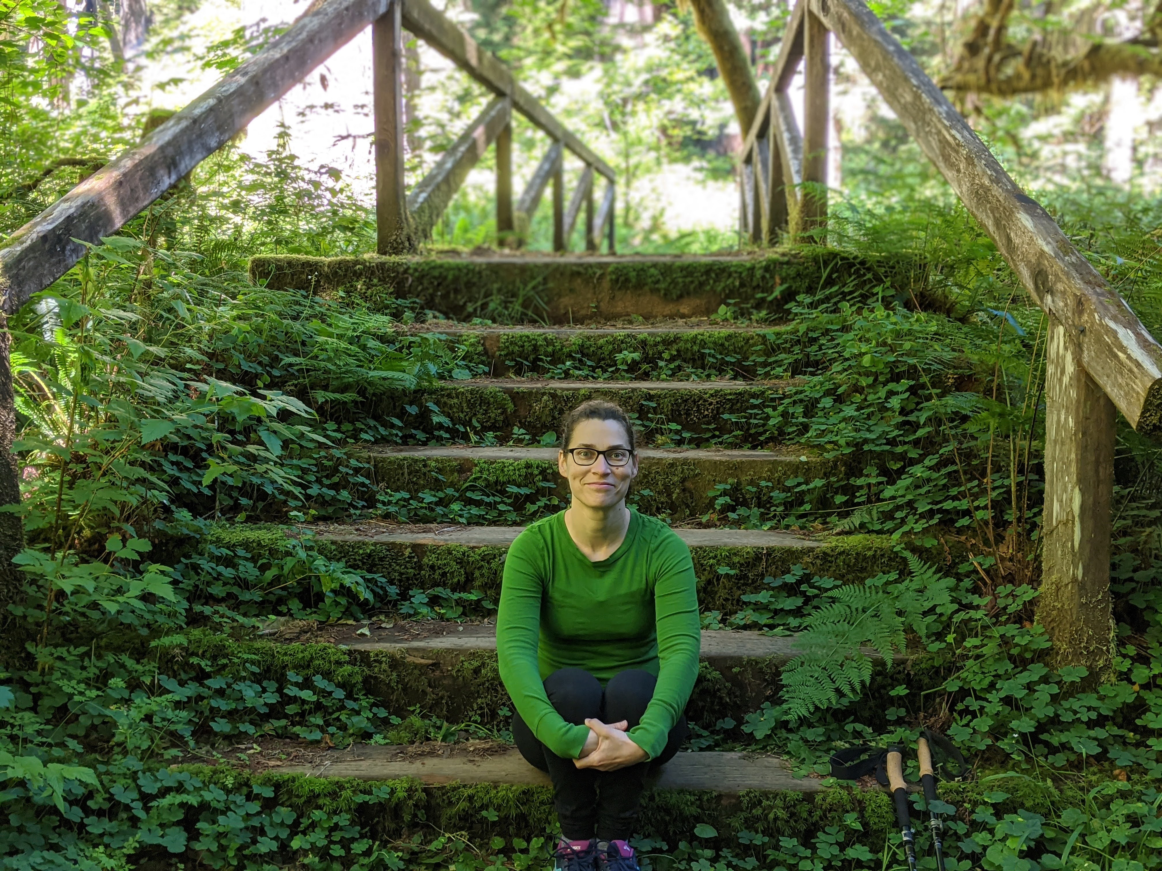 I tried to do my “squish” (engage my core), keep my poles close to my body, and keep my shoulders back and head up. Because I was holding my poles, I was not holding my husband’s hand as I would have been without them. And by “holding my husband’s hand,” I mean, gripping it, pulling it, nearly dislocating his shoulder. I even tried going up a step or two with just the poles before resorting to the (overgrown) handrail. We went over wooden bridges, and lots and lots of roots, and I did just fine. We saw snails and frogs. The air was cool. The trees were magnificent. And it was good.