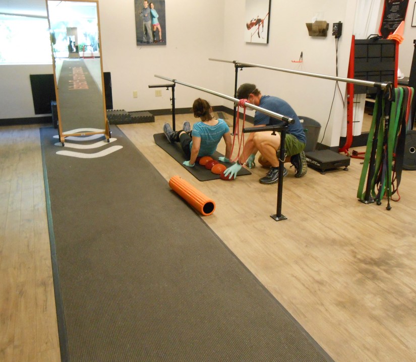 At the clinic, I am in the same room as the day before, with the short parallel bars. I ask for a mirror, and Ryan rolls one in. The mirror will help me know whether or not I’m successfully combating my hip drop. Perceptions are definitely faulty. One day this week when Jared was trying to get me to maintain level hips while on the balance board, I did my squish, held myself as level as I could, and asked, “Am I level?” Jared shook his head, came over, and moved my hips into a level position. Oh. I was way off. What’s more, I couldn’t re-create the proper posture on my next try, and Jared ended up bringing over a mirror.