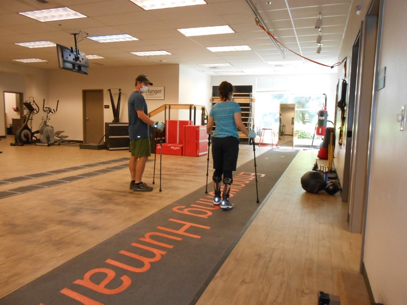 Even though it’s nowhere near four hours a day, I do practice walking in my ExoSyms. I can move around the house in them without poles, but I find that I am lurching from furniture to furniture. It’s almost as if I’m wearing roller skates, and I don’t know how to stop. Or steer. It’s hard for my brain to realize I have more balance in these, not less. That I can let go of the table and stand up straight.