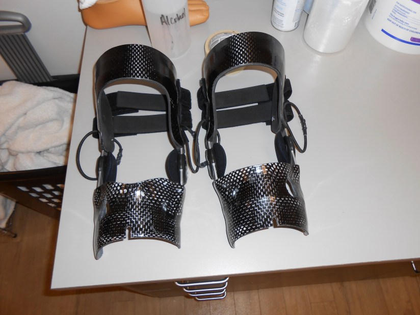 Then it’s time to take them off. Ryan shines them up for me. Gives me a stack of spare heel lifts for my shoes and several sets of hamstring assist bands. He shows me how to screw them into my devices in case one breaks. Ryan also removes the inner hamstring assist bands, leaving the outer ones. He will let me know when he thinks I’m strong enough to use both bands, based on the videos I send.