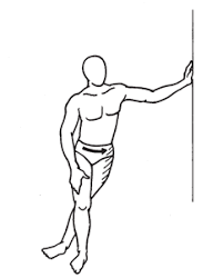 Jared also shows me a standing piriformis stretch that I really like. See? Really like. You stand on the side you want to stretch and cross the other leg over (or the picture shows behind) the standing leg. Then you just stick your hip out and twist your upper body until you feel a good stretch. I twist and bend over the parallel bar, holding on with both hands.