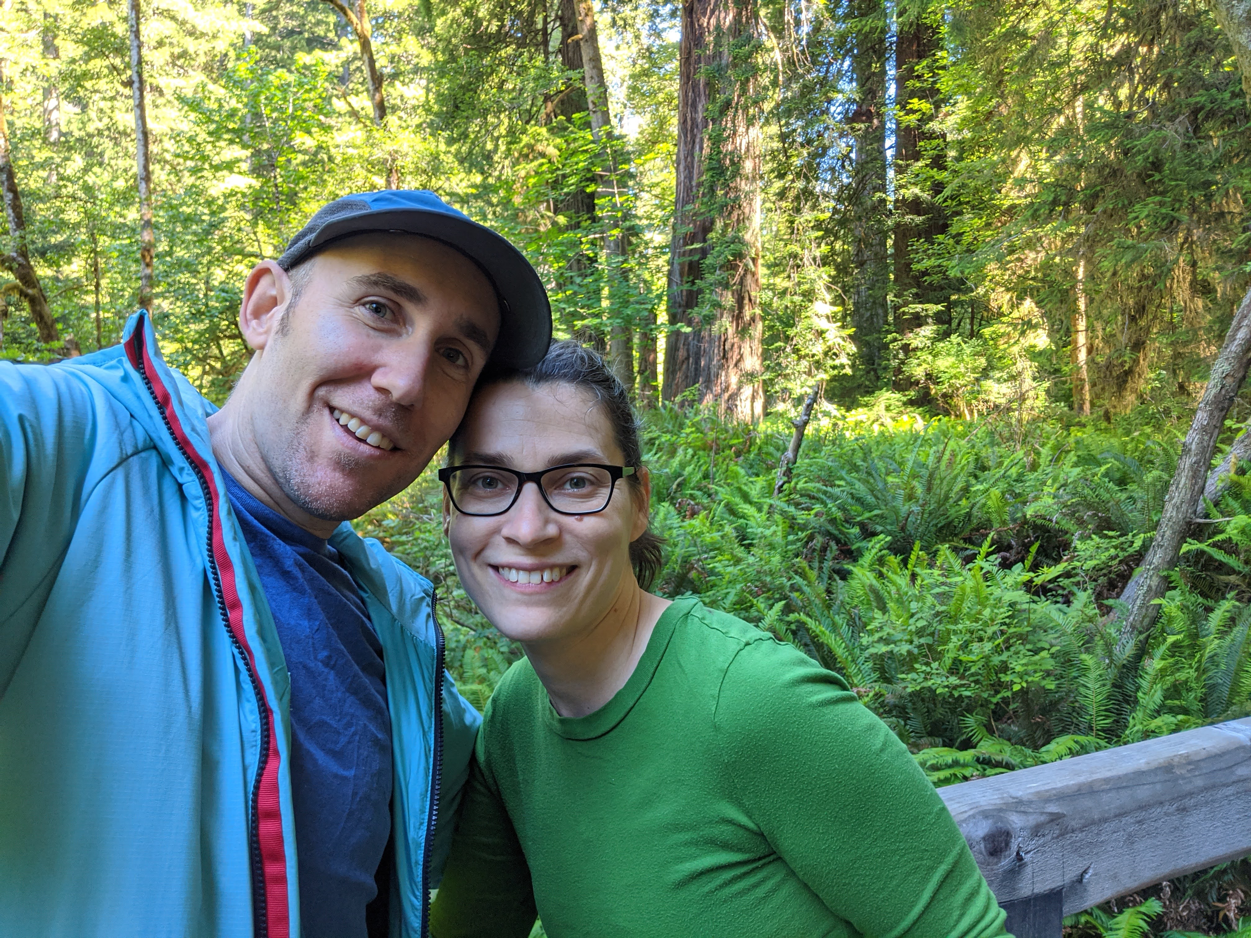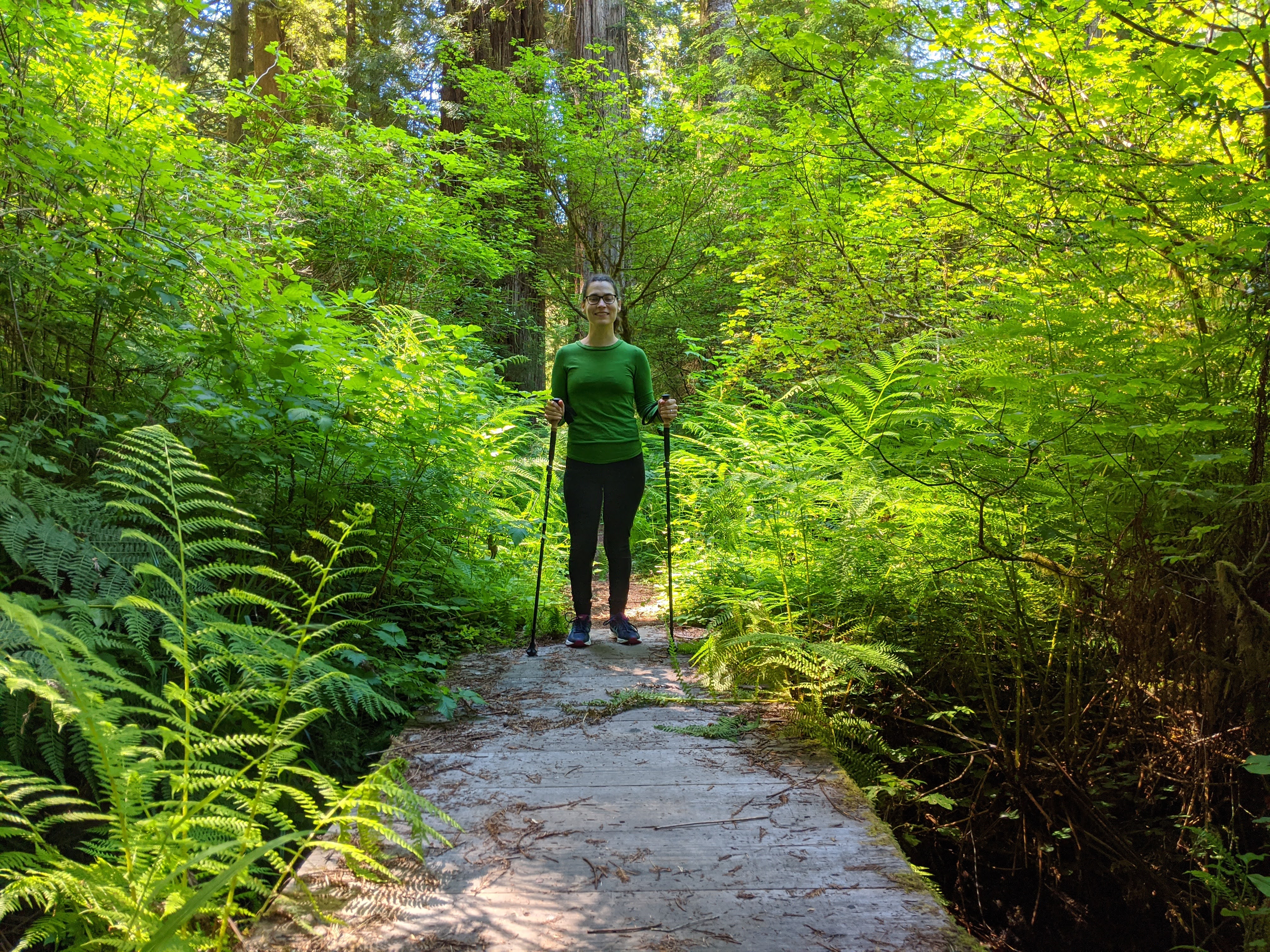 Monday morning we drove on an aptly named scenic parkway to Prairie Creek Redwoods State Park to try to find the accessible trails we’d read about. I did not even contemplate trying to wear my ExoSyms out in the wild, but this would be the first time I used my trekking poles to “trek.”