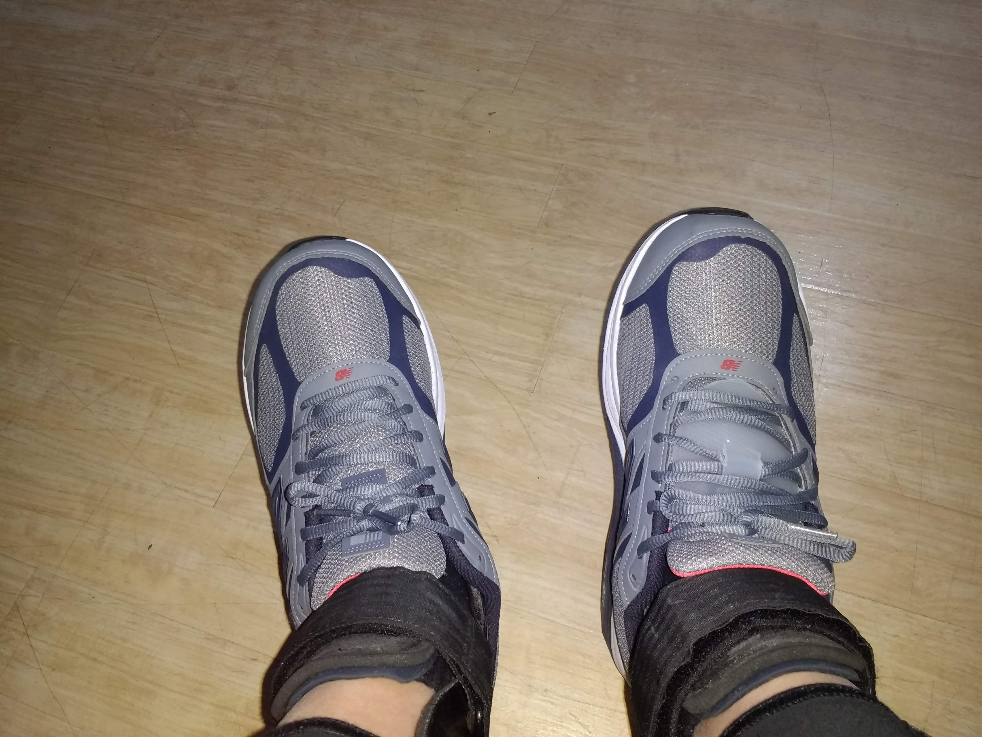 Without ExoSyms, I wear an eight, with a narrowish foot. It’s definitely easier to deal with shoes if you have two Exos and don’t have to split sizes. I also have two heel lift inserts that are the same height and will need to be worn with whatever footwear I’m choosing. Ryan put me in a 9 2E (left photo). Dominic put me in an 8.5 4E, the widest (right photo). Shoes that are too long will cause you to walk toes out and swing your leg around (think walking in flippers). I definitely do this, though I’m sure it’s not just because my shoes were a little big. Because of the lace guard that Ryan had given me for pain on the top of my right foot, Dominic showed me how to lace my right shoe completely differently. I had been wearing the 2Es with the laces as loose as they could be with barely enough left to tie. Dominic made sure I tapped my heel on the floor before tying my shoes very tightly at the ankle. A snug fit ensures that the brace doesn’t slip forward and backward in the shoe with each step. I was nervous it would be too tight and uncomfortable, but Dominic knows what he’s doing.